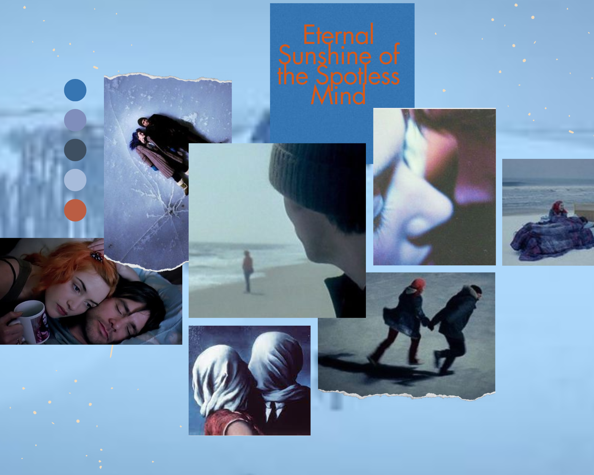 The mood board displays different images from the film as well as an image of the surrealist painting ‘The Lovers II’ by Rene Magritte, 1928. It is included in the mood board due to fitting well into the overall colour palette and the nature of the painting can be used to further interpret the film. The different muted hues of blue and soft lighting convey emotions of melancholy, nostalgia and longing a well as creating a dream-like atmosphere, which is also present through the mise-en-scene in the film. The relationship between Joel and Clementine is laid out throughout the film are out of order as the scenes are segmented alluding to how unreliable memory can be and how it can distort our reality. The chronology of their relationship is time-stamped by the change of Clementine’s hair as we go through Joel’s memories of her; when they meet Clementine’s hair is green, the dye being called “green revolution”, as they meet in spring perhaps symbolising the growth of their relationship. When they are dating Clementine’s hair is red, “red menace” as the dye is called, notes how warm and passionate their love was during the summer and the good periods of their relationship. During their rough patch her hair is orange, dyed in the colour “agent orange”, mirrors the autumn where the leaves fall and the trees die, essentially their desire in the relationship fading away as they start to fight more. During their reunion in the winter (after they have broken up and erased their memories of each other), Clementines hair is dyed blue with the dye being named “blue ruin” noting the hardship that their relationship has endured so far and as they agree to try again could also foreshadow them breaking up again. The colours and dye names give more insight into Clementine’s personality and perhaps tell her perspective as we watch the film from Joel’s point of view. If you take away the colours from the names of the dyes you’re left with revolution, menace, agent, and ruin; revealing her humanity, her lack of agency in her relationship with Patrick as he took advantage of the fact he was aware of her memories after she erased them and used that to begin a relationship with her and may also note the other side of the ‘Manic Pixie Dream Girl’ trope ,which Clementine embodies, with its connection to mental illness. Mary Jane Coppock explains: